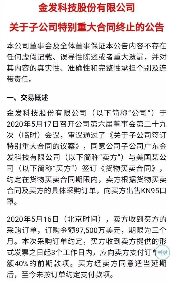 8月9日晚間,金發科技發布公告稱,子公司廣東金發5月與美國某公司簽訂《貨物買賣合同》,向后者出售KN95口罩,根據采購訂單,訂購金額9.75億美元,期限為三個月。目前三個月履行期限行將屆滿,公司一直未收到買方按訂單應支付的40%前期款項,也未收到合同訂單是否繼續履行或延期履行等事項的有效回復。公司分析認為,本次合同訂單未得到買方的履行且合同訂單實際已經終止。
