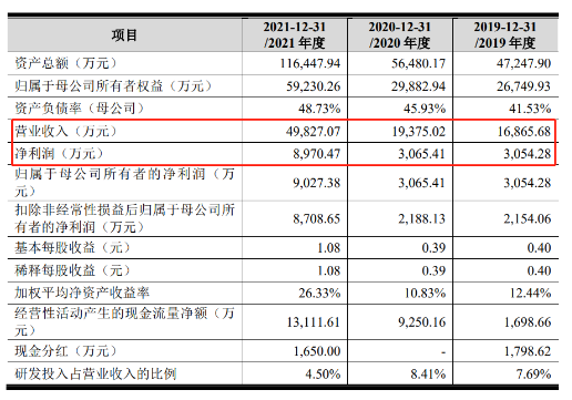 業(yè)績方面,惠通科技2019年、2020年、2021年營收分別為1.69億元、1.94億元、4.98億元;凈利分別為3054萬元、3065萬元、8970萬元;扣非后凈利分別為2154萬元、2188萬元、8709萬元。