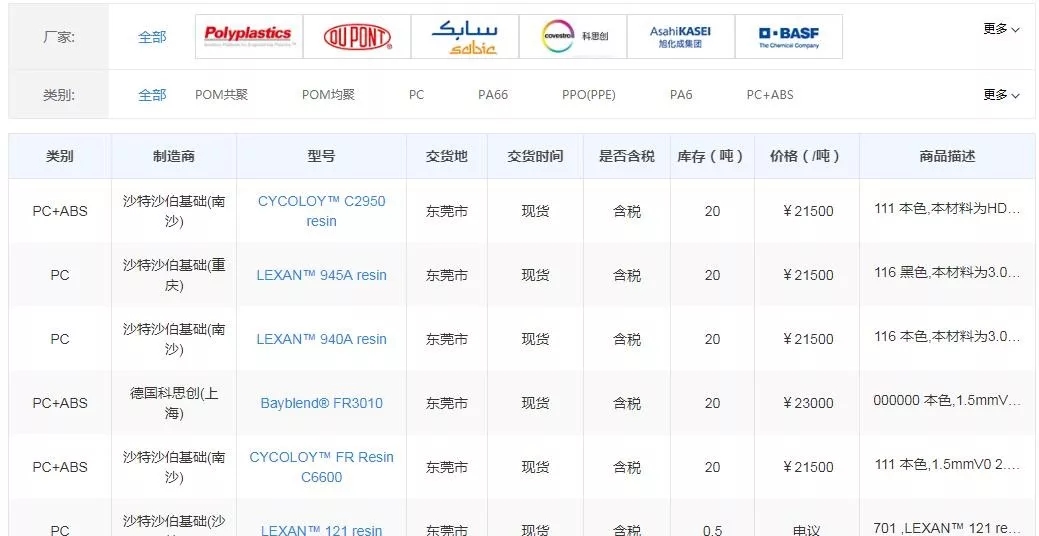 SABIC沙伯基礎(chǔ)PC+ABS:C2950、C6600等;PC:945A、940A、121、121R、221R、141R、141、241R、201、201R、HF1110、HF1130等。