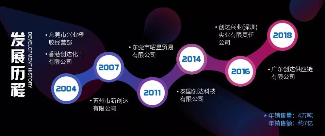 2004年東莞市興業(yè)塑膠經(jīng)營部,香港創(chuàng)達化工有限公司成立;2007年蘇州市新創(chuàng)達有限公司成立;2011年東莞市昭昱貿(mào)易有限公司成立;2014年泰國創(chuàng)達科技有限公司成立;2016年創(chuàng)達興業(yè)(深圳)實業(yè)有限責(zé)任公司成立;2018年廣東創(chuàng)達供應(yīng)鏈有限公司成立。