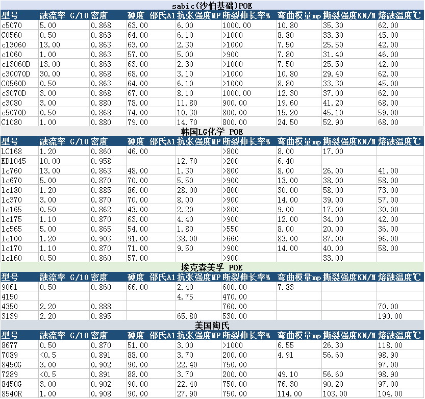 五、斷裂伸長率:沙伯基礎poe牌號平均值最高。