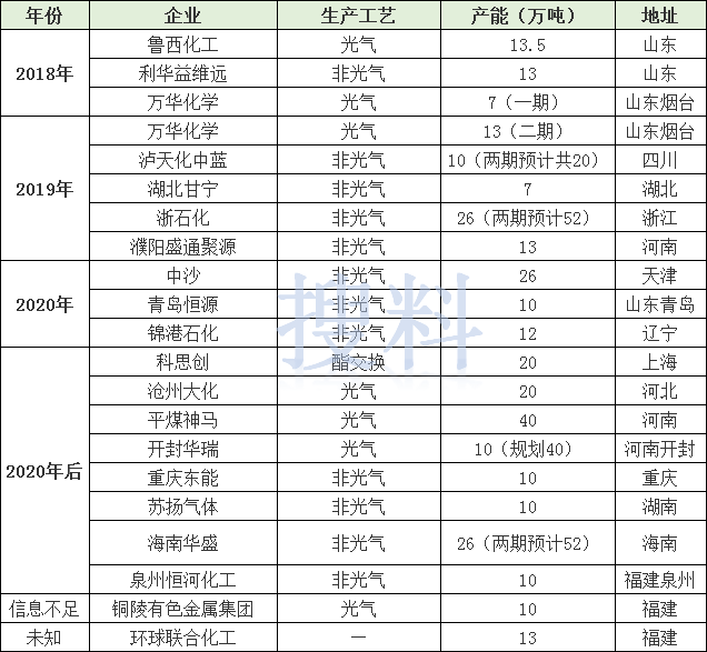 在接下來2-3年是國內(nèi)聚碳酸酯產(chǎn)能的高速增長時期,預(yù)計新增288.5萬噸產(chǎn)能,單看數(shù)據(jù)不足以說服,接下來一一列舉新產(chǎn)能,以企業(yè)公布的消息準(zhǔn),部分企業(yè)信息不足。
