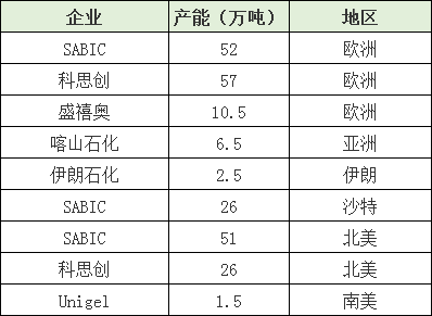 全球PC累計233萬噸,主要集中在美洲及歐洲,下表僅為全球產(chǎn)能部分統(tǒng)計,如有遺漏歡迎指點。
