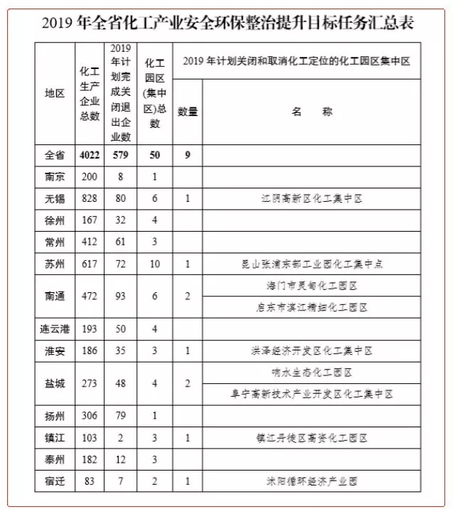 其中提到,全省共排查出列入整治范圍的化工生產企業4022家,計劃關閉退出1431家,停產整改267家、限期整改1302家、異地遷建77家、整治提升945家。2019年全省計劃關閉退出579家,計劃關閉和取消化工定位的化工園區(集中區)9個。