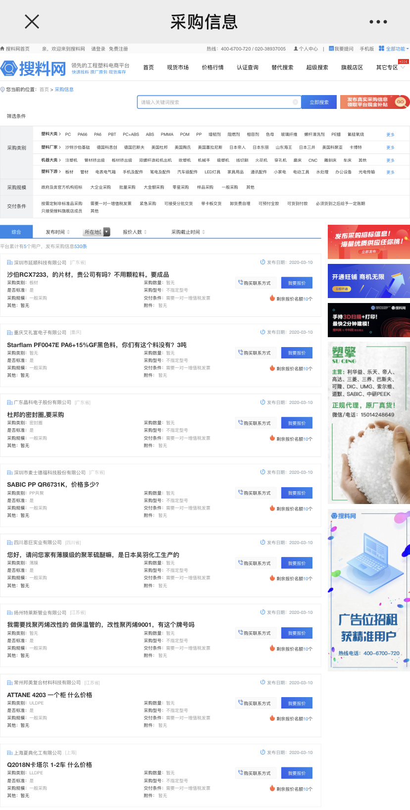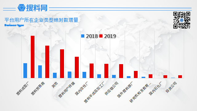 2019年中國塑料產業在增速上相比前兩年有所放緩,但是塑料互聯網用戶活躍度并沒有下降。2019年塑料行業用戶通過手機端或電腦端觸網數量均明顯增長,手機端用戶占比增加5%搜料網用戶突破5.8萬,訪客量達兩百萬
