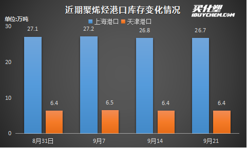據統計,目前上海港口聚乙烯庫存約為26.7萬噸,天津港口聚烯烴庫存約為6.4萬噸,進入9月后,聚烯烴港口庫存呈下降趨勢。雖去庫存效果緩慢,但對行情仍有一定利好。