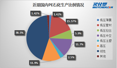 聚乙烯方面,目前國內主要PE生產企業合計產能共計1760萬噸左右。其中生產線性產能占比約為38.5%,低壓管材生產占比15.57%,高壓生產占比11.9%,低壓中空生產占比11.7%。除檢修外,全國PE石化企業整體開工約90%。