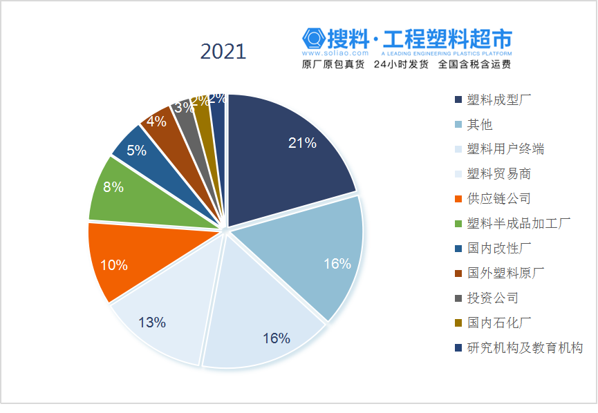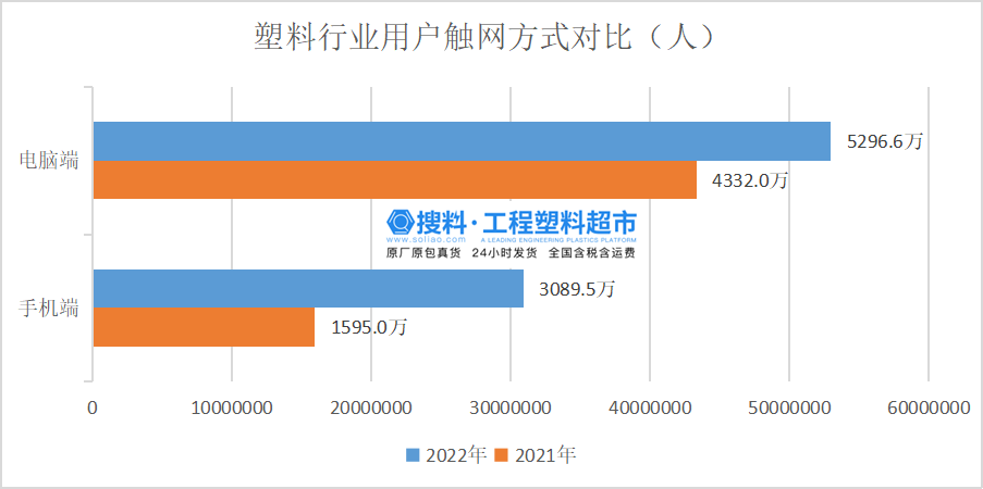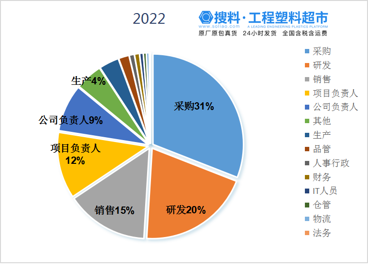 從企業類型來看,2022年及2021年兩年,塑料成型廠(典型代表如富士康)和塑料用戶終端(典型代表如華為)通過互聯網搜料、問料、買料的習慣及趨勢并沒有因疫情受到影響,依舊是塑料產業數字化的主力軍。在這些使用互聯網的塑料行業人員當中,2022年有高達75%是他們各自所在企業的選料用料買料決策者(采購、研發、項目負責人、公司負責人、生產)。一個簡單的例子是,截止到2022年底,華為和富士康都各有123名上述崗位的員工在使用【搜料·工程塑料超市】。