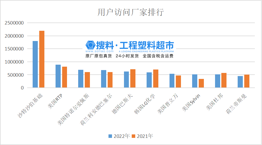 作為中國領先的工程塑料數字化產業平臺,2022年【搜料·工程塑料超市】的塑料行業注冊用戶數量已經突破12萬個,訪客量達到8002807人次,累計點擊量約15億次,承諾只賣原廠原包真貨的供應商(大多是原廠、代理商、經銷商)超500家,平臺新增詢盤線索數量穩定增長,并順利完成17億元人民幣的銷售額。