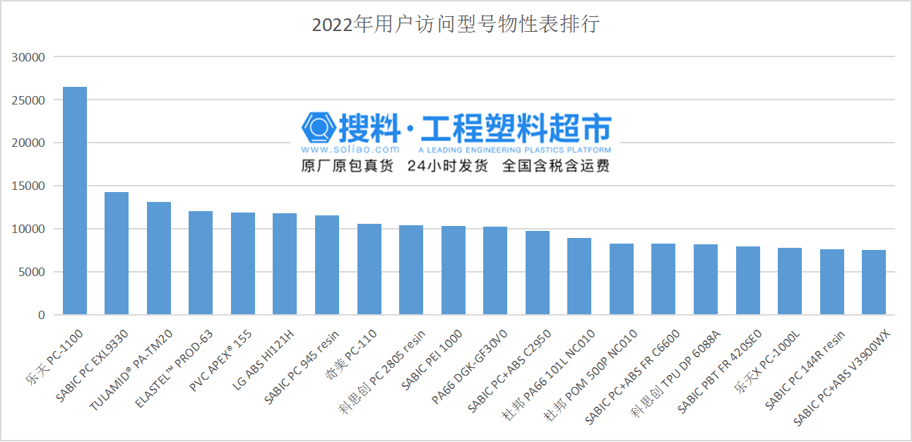 從塑料行業從業人員最關心的塑料型號來看,2022年,關注度最高的牌號分別為韓國樂天 PC-1100、SABIC PC EXL9330、TULAMID® PA-TM20、ELASTEL™ PROD-63,其中韓國樂天 PC-1100 搜索量約高達SABIC PC EXL9330搜索量的2倍。