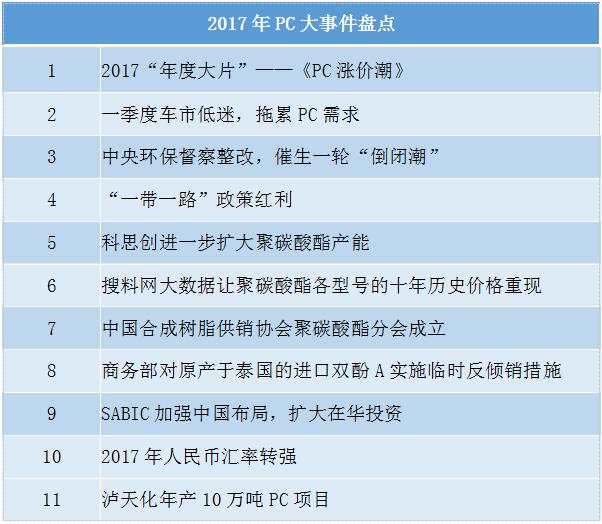 2017年,PC堪稱塑料界的一匹黑馬,尤其是下半年的漲勢不止,大家都是有目共睹的。SABIC、科思創、樂天、帝人、盛禧奧等大廠也接連發了幾次漲價函。因此,把漲價作為PC的2017年度大事件之首,也不為過。