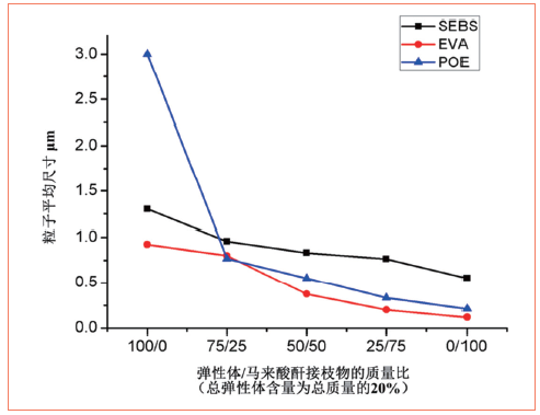 圖3 不一樣類型彈性體以及馬來酸酐接枝物占比對分散相粒子規格尺寸的危害