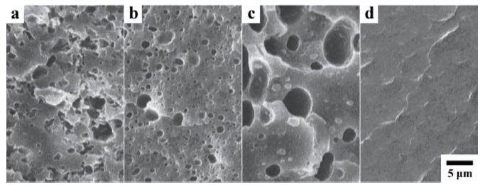 在PA6中添加純碎的SEBS,獲得的外部經濟構造是不規律的空穴(圖2a),說明SEBS在基材中的遍布特性是不規律粒子,而經馬來酸酐改性后的SEBS在基材中則為球型粒子,規格較小且遍布勻稱(圖6b)。圖2c為純碎的POE彈性體,對比于SEBS,POE在基材中呈球型遍布,但規格大且不勻。歷經改性后,彈性體粒子在基材中規格十分小、遍布勻稱,即便離子注入后也不可以觀查到顯著的空穴構造(圖2d)。