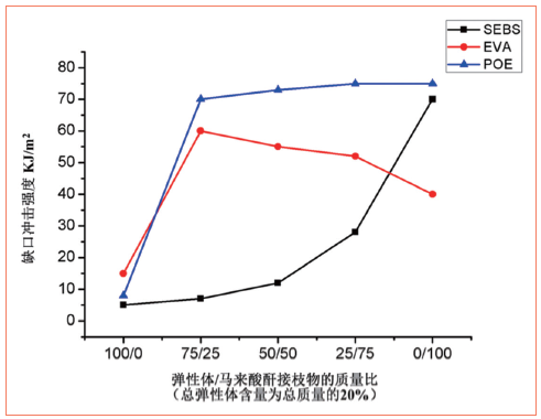 較為了SEBS、EVA、POE以及相匹配的馬來酸酐接枝物用以PA6改性對復合型產品的沖擊性抗壓強度的危害。試驗說明,僅用純彈性體改性,三者中EVA的改性實際效果稍好,伴隨著馬來酸酐接枝彈性體的添加,沖擊性抗壓強度明顯提高,綜合性改性實際效果,三者中POE最優化。