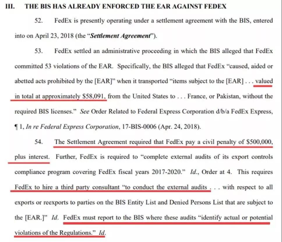 聯邦快遞因53起“違規事件”被迫與美國商務部工業安全局簽訂一項和解協議,為總價58091美元的快遞物品支付了足足50萬美元外加利息的罰款,是涉案物品金額的860%。