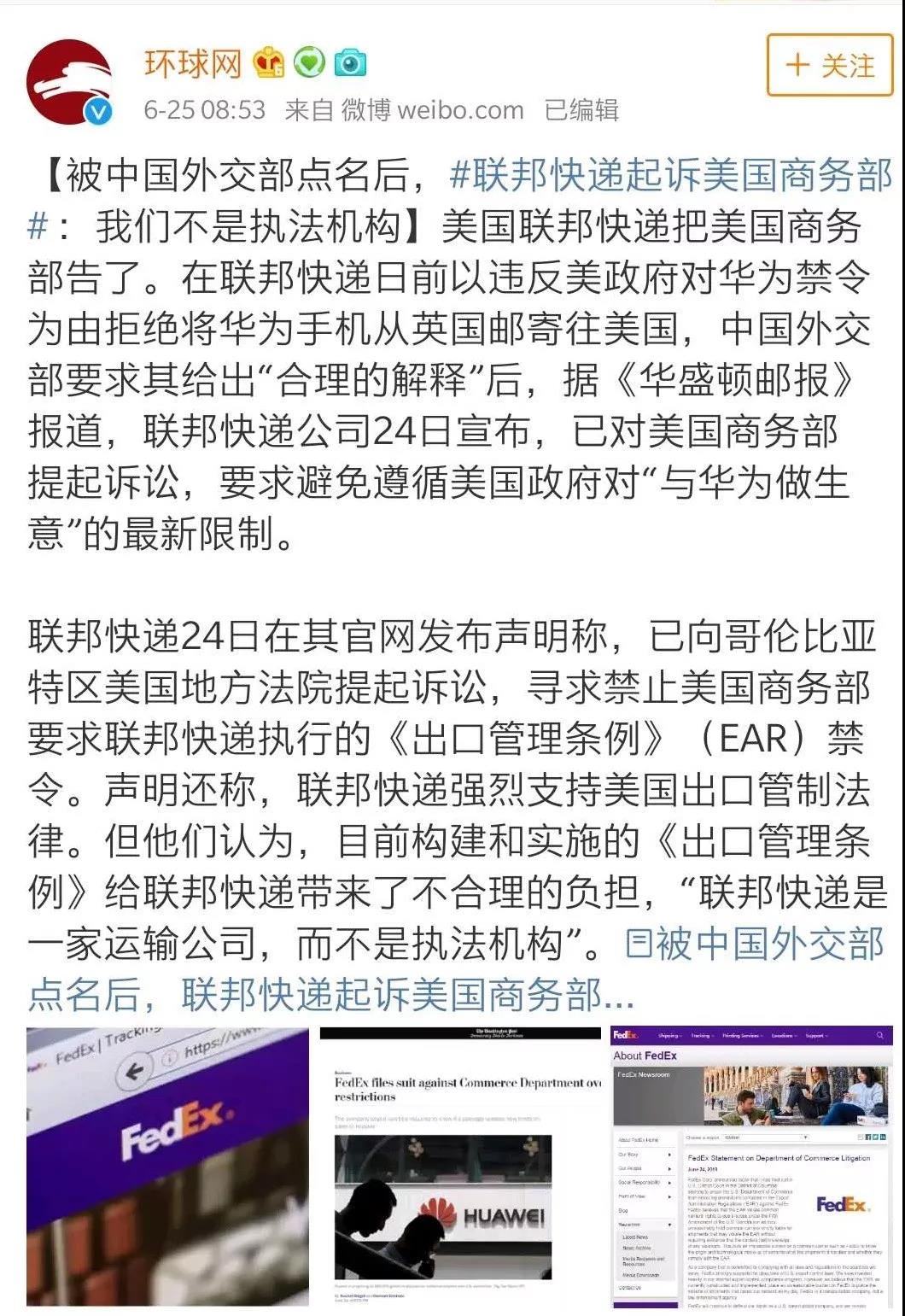 外媒6月24日報道,美國聯邦快速(FedEx)周一對美國商務部提起訴訟,要求避免遵循美國政府對“與華為做生意”的最新限制。
