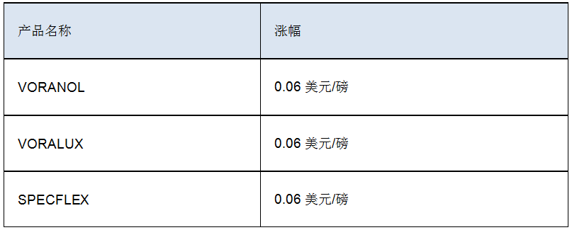 自2020年2月28日起,或在合同允許的情況下,陶氏代表其自身及其適用的合并子公司(“陶氏”)將北美地區(qū)所有等級和規(guī)格的多元醇產(chǎn)品價格提高以下所列金額: