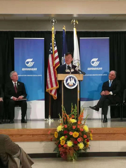美國當地時間11月16日下午,在路易斯安那政府官員、中國駐休斯敦總領事館總領事、當地社區及客戶代表的共同見證下,萬華化學集團股份有限公司副總裁、Wanhua Chemical US Operations LLC CEO華衛琦博士與路易斯安那州州長約翰?愛德華茲先生共同宣布,萬華化學美國MDI一體化項目將正式落戶路易斯安那州St. James區Convent市。