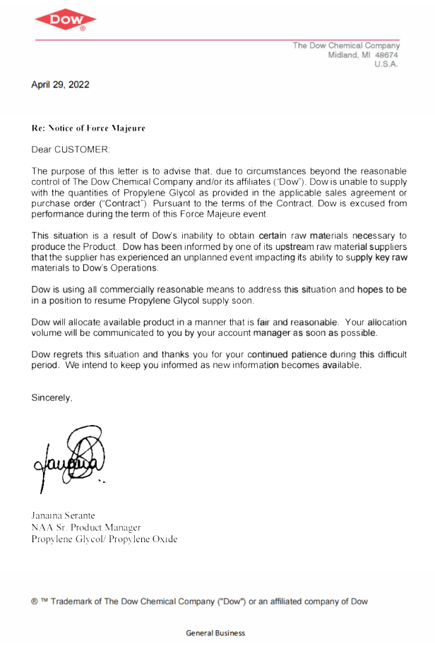 已有人閱讀此文 - -近日,陶氏在客戶告知函中稱,由于公司發生了無法合理控制的情況,陶氏無法提供銷售協議或采購訂單("合同")中規定的丙二醇的數量。根據合同的條款,陶氏在此不可抗力事件的期限內被免除履約。