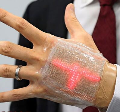 在試驗中,研究人員使用醫療用粘合劑將顯示屏貼在手上,放映出了心電圖的波形和數字等簡單視頻。