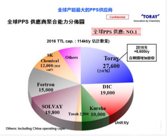 東麗是世界上最大的PPS供應商,包括上游原料和聚合物的生產以及樹脂,纖維和薄膜產品的銷售。東麗每年生產PPS聚合物27600噸,其中包括在2016年開始運營的韓國工廠,以及日本東海的工廠。