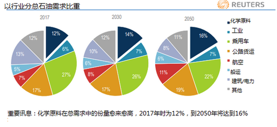 隨著電動(dòng)汽車的發(fā)展,以及發(fā)動(dòng)機(jī)能效提高,到2050年時(shí)交通對(duì)石油的需求料放緩,但這會(huì)被石化產(chǎn)品需求增長(zhǎng)抵消。