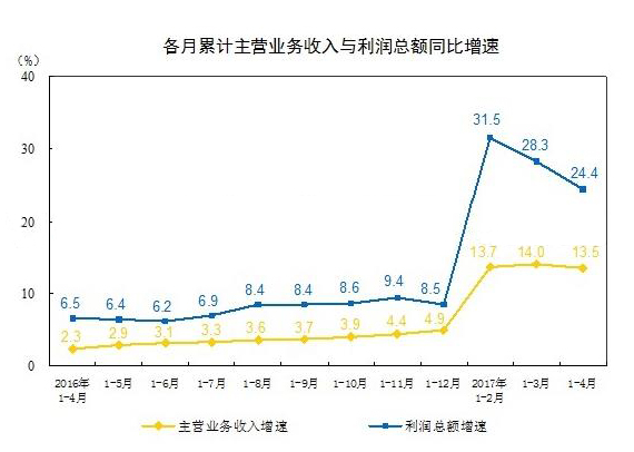 已有人閱讀此文 - -據中國統計局全新統計分析顯示信息,1~4月我國規模以上制造業企業完成主要經營的業務收益37.7萬億元rmb(相同),同比增長13.5%;完成利潤總金額22780.三億元,同比增長24.4%,增長速度比1-3月份變緩3.9個點。產生主要經營的業務成本費32.2萬億元,同比增長13.4%。