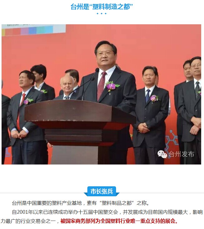 10月12日,第十六屆中國塑料展銷會在臺州市國際性展覽中心舉辦。王昌榮、張兵、薛少仙、元茂榮等四套班子領導干部參加開幕會。