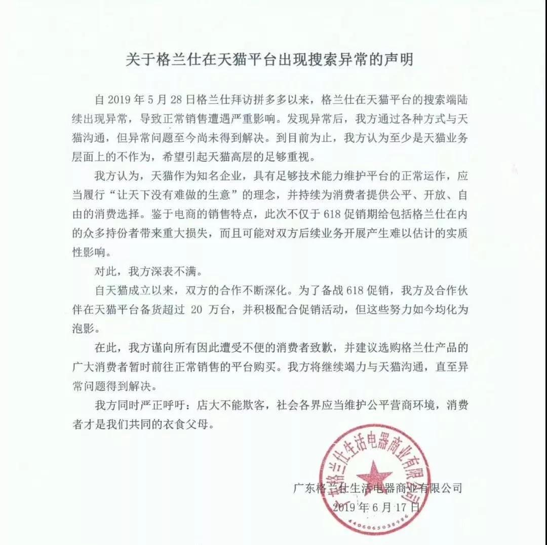 自2019年5月28日格蘭仕拜訪拼多多以來,格蘭仕在天貓平臺(tái)的搜索端陸續(xù)出現(xiàn)異常,導(dǎo)致正常銷售遭遇嚴(yán)重影響。發(fā)現(xiàn)異常后,我方通過各種方式與天貓溝通,但異常問題至今尚未得到解決。到目前為止,我方認(rèn)為至少是天貓業(yè)務(wù)層面上的不作為,希望引起天貓高層的足夠重視。