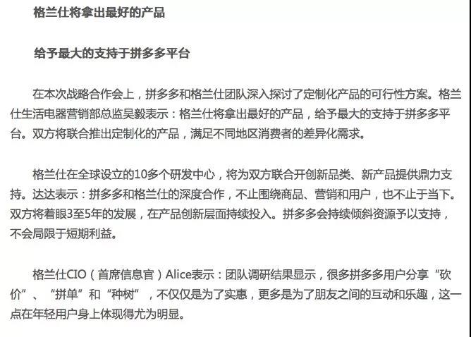 在拼多多比較孤立的時(shí)候,格蘭仕發(fā)布了上述支持拼多多的宣告: