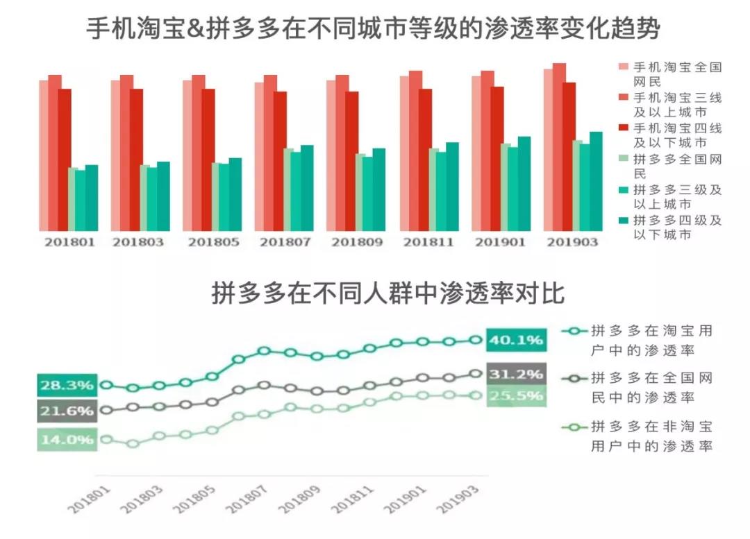 在這種背景下,拼多多的用戶和GMV實(shí)現(xiàn)了平衡增長(zhǎng),對(duì)天貓?zhí)詫毝际侵卮筇魬?zhàn),另外,據(jù)極光大數(shù)據(jù)報(bào)告顯示,截至2019年第一季度,新電商平臺(tái)拼多多的新增用戶中有44.2%來自二線及以上城市,呈持續(xù)上升趨勢(shì)。而拼多多對(duì)淘寶用戶的滲透率也在提升,從去年同期的28.3%上升到了40.1%。