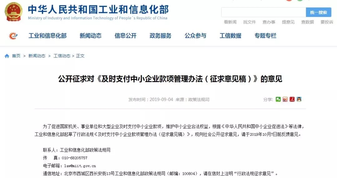 從工信部網(wǎng)站獲悉,為了促進國家機關、事業(yè)單位和大型企業(yè)及時支付中小企業(yè)款項,維護中小企業(yè)合法權益,根據(jù)《中華人民共和國中小企業(yè)促進法》等法律,工業(yè)和信息化部起草了行政法規(guī)《及時支付中小企業(yè)款項管理辦法(征求意見稿)》,明確規(guī)定國家機關、事業(yè)單位和大型企業(yè)從中小企業(yè)采購貨物、工程、服務的,應當在30日內(nèi)付款。