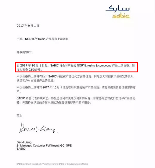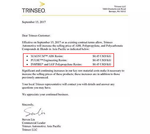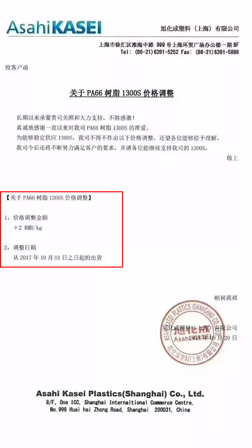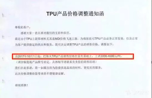 PA6產(chǎn)品上漲150美元/噸,折合人民幣約1000元/噸;PA66產(chǎn)品上漲300美元/噸,折合人民幣約2000元/噸;TPU產(chǎn)品上漲3000~4000元/噸,2017年10月1日起實(shí)施。
