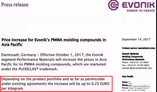 PMMA上漲0.25歐元/公斤,折合人民幣約1950元/噸,2017年10月1日起實(shí)施。