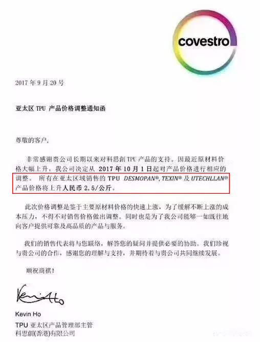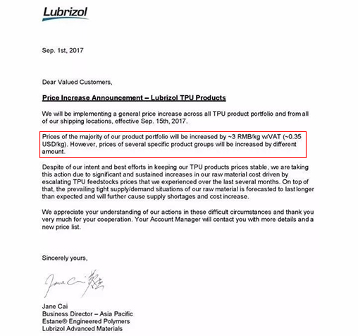 亞太區(qū)TPU產(chǎn)品上漲2500元/噸,2017年10月1日起實(shí)施。