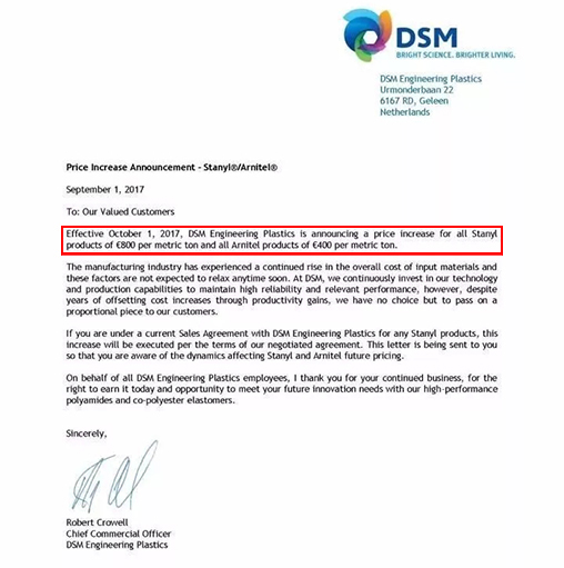 TPEE漲價(jià)470美元/噸,折合人民幣約4000元/噸;PA46漲價(jià)940美元/噸,折合人民幣約8000元/噸,2017年10月1日起實(shí)施。