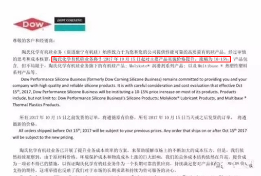 有機(jī)硅漲價(jià)10~15%,2017年10月15日起實(shí)施。
