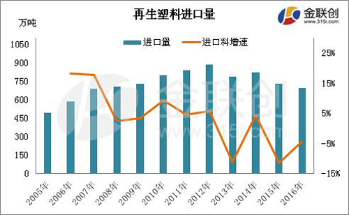 進口品質層面,2012年以前,海外出入口到我國廢舊塑料35%為清理后的,2013年清理產品的占有率提升到47%;截止2016年清理產品占到80%之上。進口總數層面,自2013年至今,再生塑料進口量增長速度總體展現下滑發展趨勢。2016年再生塑料進口量僅有696.17萬噸級,增長速度為-4.43%。清除中國剛性需求皮軟要素,進口量少的關鍵緣故為中國對進口廢棄物利用層面管控幅度持續增加,進口料實際操作難度系數提升。