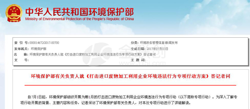 近些年的自然環境稽查檢查發覺,一些進口廢物生產加工利用公司規模小、環境污染比較嚴重,環保治理設備異常運作等自然環境違紀行為比較突顯,提升了地區空氣污染負載,也給某些地域導致了比較嚴重空氣污染。4月18日,中間全方位改革創新領導組第三十四次會議決議根據了《關于禁止洋垃圾入境推進固體廢物進口管理制度改革實施方案》。為貫徹執行中間決策部署,切合人民大眾對優良生態環境保護的新規定和新希望。環境保護部在項目前期的基本上,決策進行歷時一個月的專項行動,嚴厲打擊進口廢物生產加工利用公司的自然環境違紀行為。