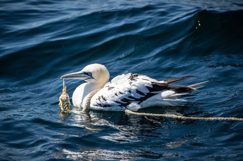 在皮雷斯什尼什群島,一只塘鵝被塑料纏上了。