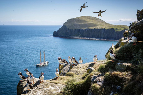 希恩特群島是海鳥的棲息的地方,這里有很多的飛禽,包含角嘴海雀、紅嘴鷗及其刀嘴海雀等。另外,它也是北方地區紅霞、鸕鶿、賊鷗及其三趾鷗的家。圖為希恩特群島上的角嘴海雀。