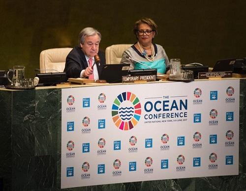 聯合國理事長古特雷斯(左)5日在紐約公布初次海洋大會揭幕(路透社)