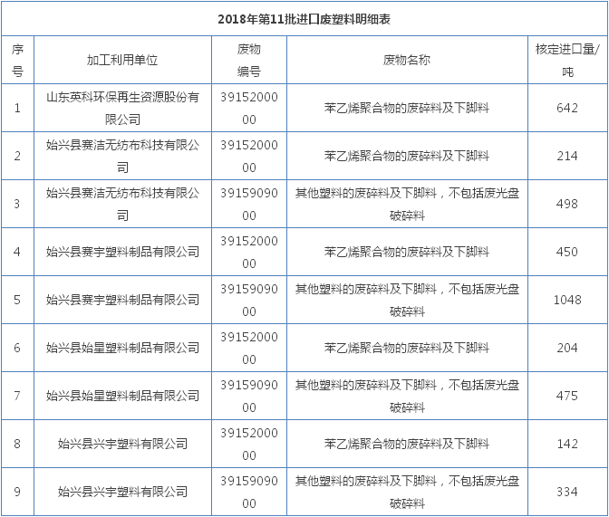 2018年第11批廢塑料出口批文公示,5家企業獲批4007噸