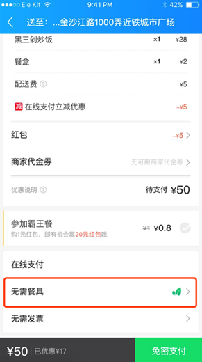 1. 9月中下旬,新版本餓了么APP將在提交訂單確定頁加上“不用廚具”備注名稱選擇項,并為挑選此項備注名稱的客戶出示積分獎賞;