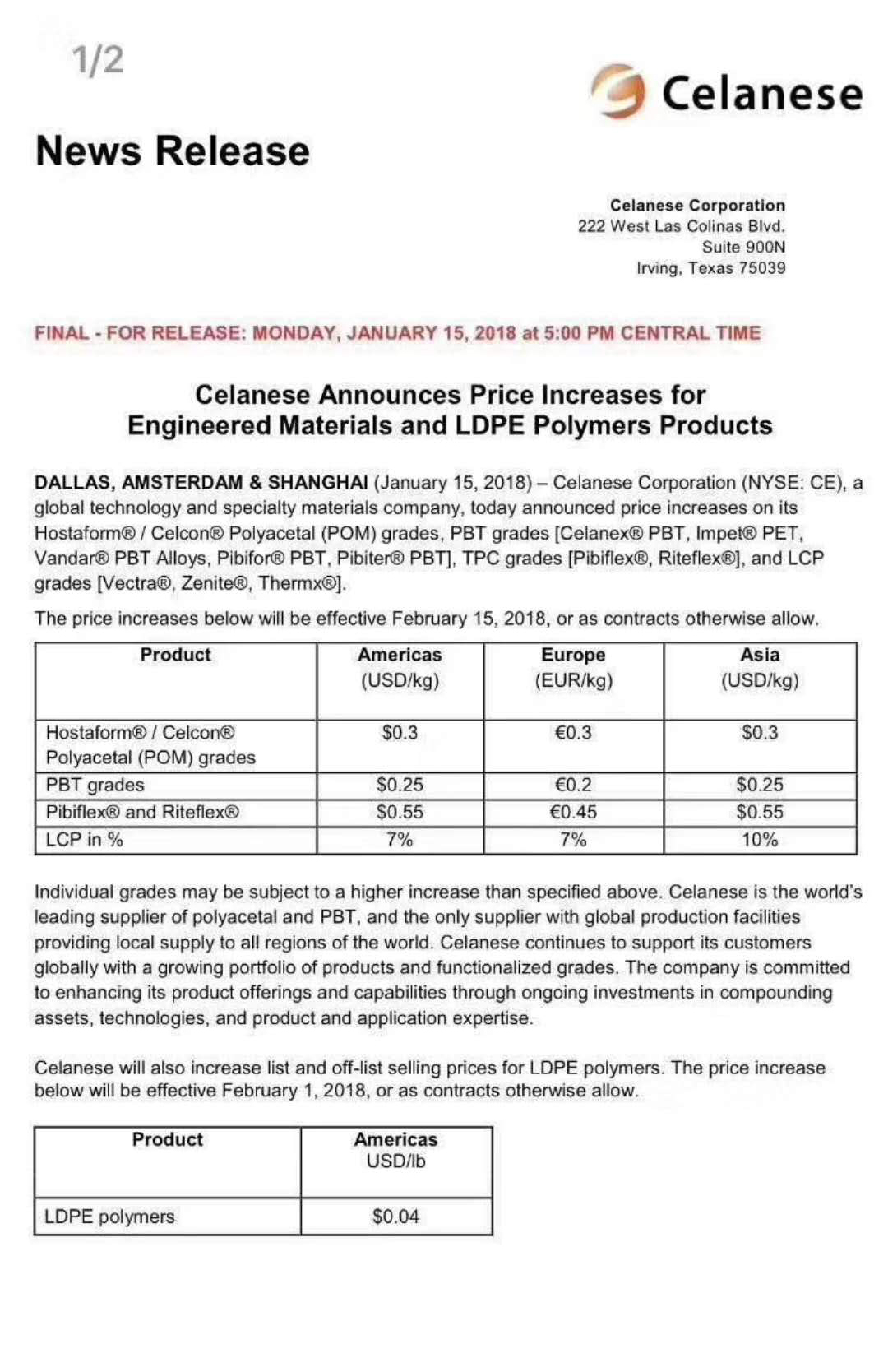 最新漲價函!塞拉尼斯POM、PBT、LCP等產品齊上漲