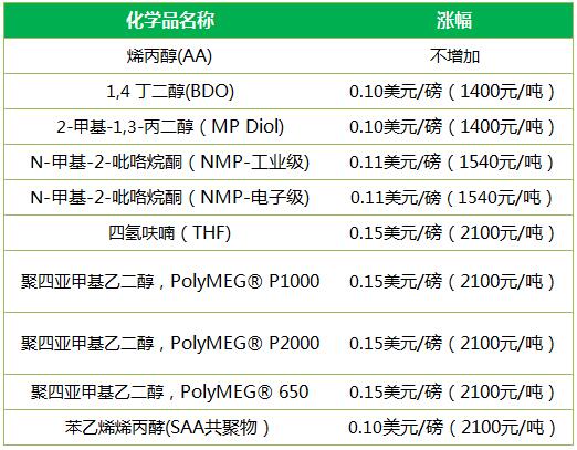 自2018年4月1日起,或合同允許之日,利安德化學(xué)公司將增加以下的1,4丁二醇及衍生品的價格: