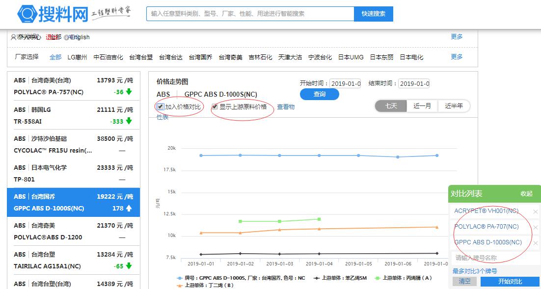搜料網(wǎng)價(jià)格專題不僅收錄了超3000多種材料型號(hào)的各個(gè)主流廠家價(jià)格,還有各個(gè)產(chǎn)品上游單體價(jià)格,同時(shí)您也可以選擇其他牌號(hào)產(chǎn)品與當(dāng)前產(chǎn)品進(jìn)行價(jià)格比對(duì)。如果您是塑料行業(yè)的新人,搜料網(wǎng)可以幫助您及時(shí)了解市場(chǎng)價(jià)格;如果您是塑料行業(yè)專家,搜料網(wǎng)將和您共同把握市場(chǎng)。