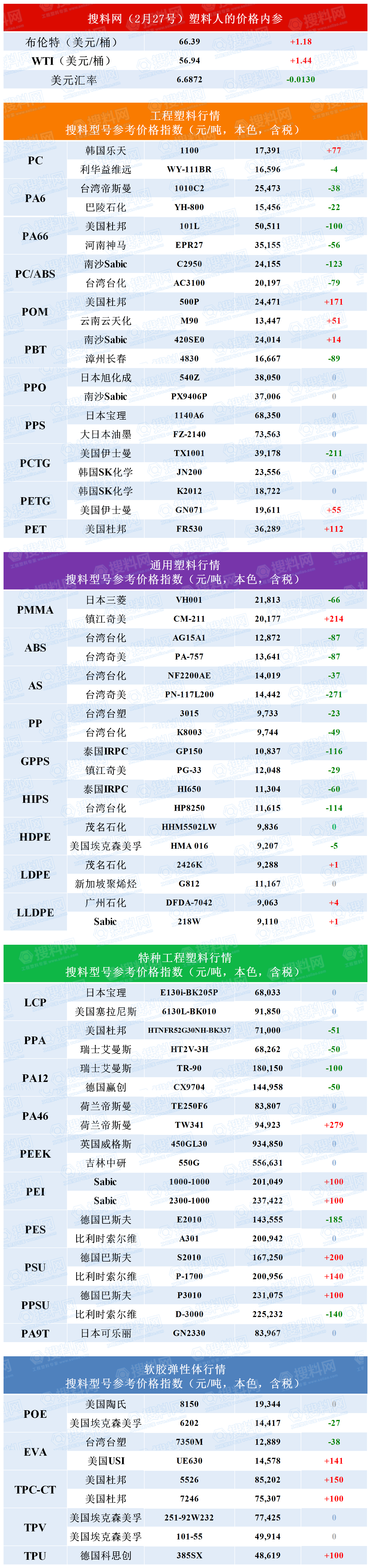 塑界行情:35種塑料70個慣例型號威望參考價(通用/工程/特種/軟膠)