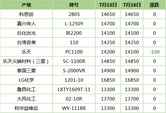 臺灣奇美PC裝置14萬噸/年,生產線2條,產能分別為6.5萬噸/年和7.5萬噸/年,目前裝置開工基本正常,市場貨源供應充足。