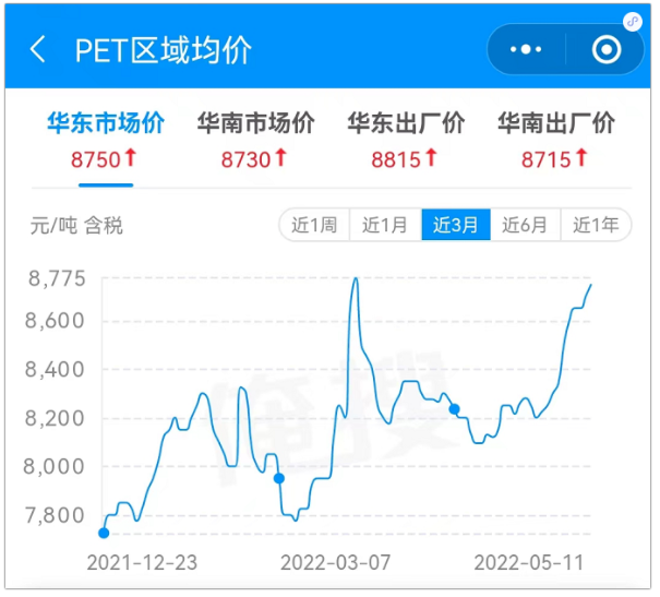 從華東市場上來看:PET瓶片在近三個月里波動上行,基本走勢與原油相一致,自年初市場主流均價報7650元/噸,截至5月11日,報750元/噸,3個月內漲幅12%,現貨一噸暴漲950元!